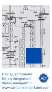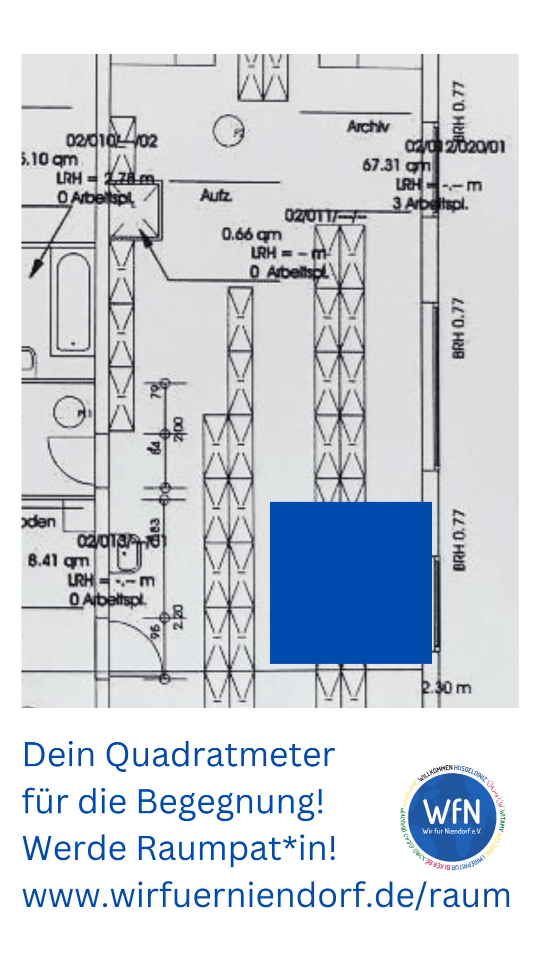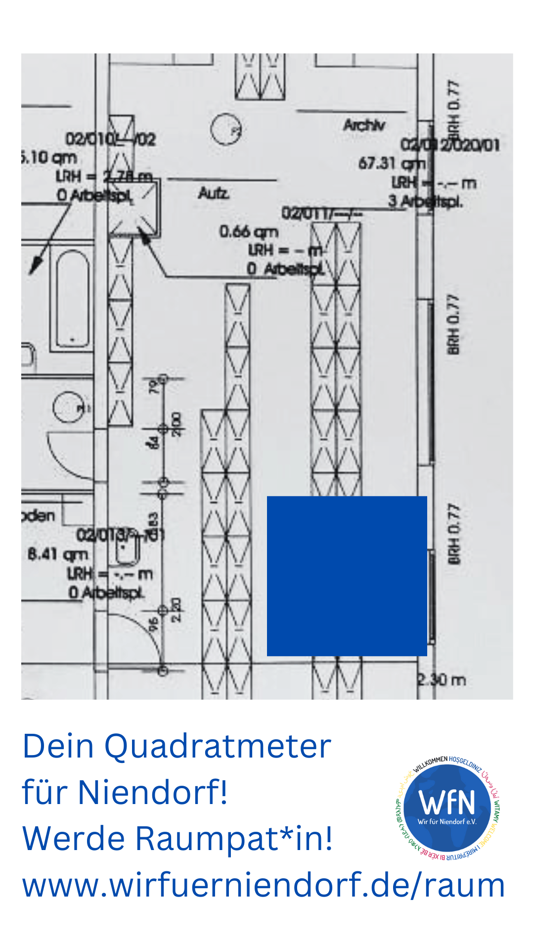 Ein Quadratmeter kostet warm etwa 20 €. Wenn Sie hier als Raumpat*in helfen können und finanzielle Unterstützung über einen längeren Zeitraum anbieten können, melden Sie sich bitte per E-Mail: raum@wirfuerniendorf.de oder geben einfach das ausgefüllte Formular in der Alten Schule ab.